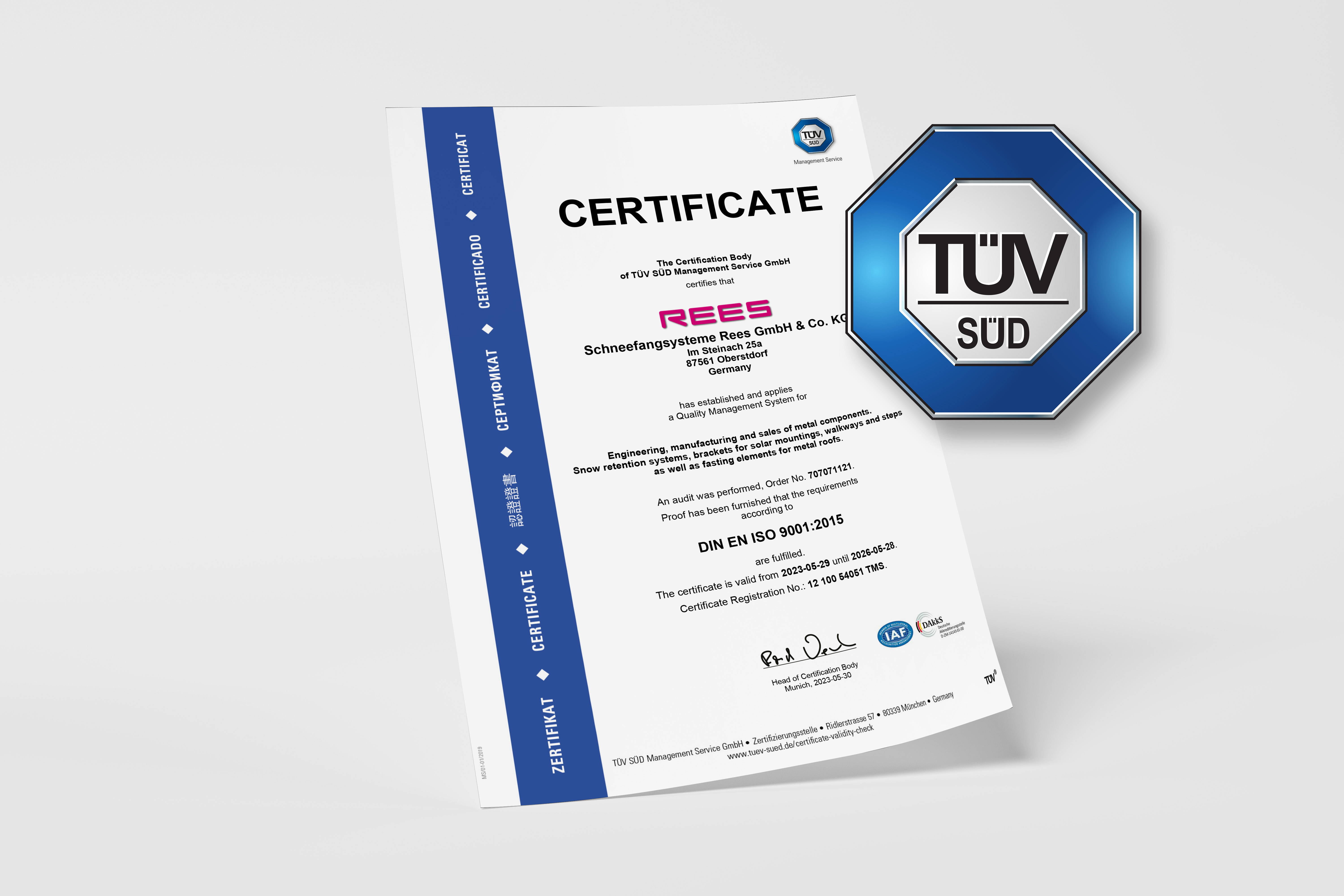 Seit Mai 2017 trägt die Schneefangsysteme Rees GmbH & Co. KG das Qualitätszertifikat DIN ISO 9001:2015. Mit der Erteilung des Zertifikats bescheinigt der TÜV Süd, dass die hohen Qualitätsstandards für die Geschäftsprozesse eingehalten werden und ein Qualitätsmanagementsystem entsprechend den Vorgaben der ISO Normen erfolgreich eingesetzt wird.
