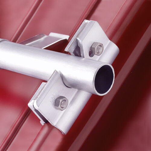 Snow retention bracket for round head profile like Kalzip, Bemo, EuroRib and similar. Suitable for tubes with an outer diameter of max. 33 mm. With stainless steel screws (A2) M8 x 25 and nuts (A2) M8. According to the technical rules for the German plumbing trade.